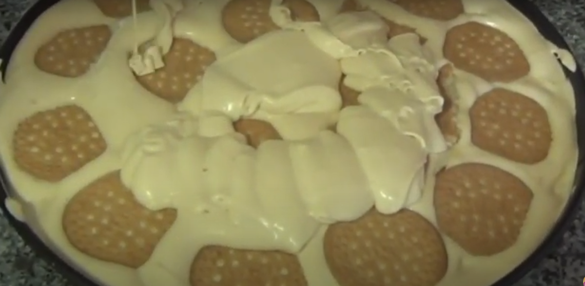 Ингредиент • 2 упаковки печенья Мария • Пакетик шоколадного крема • Конверт с ванильным заварным кремом (который, если хотите, можно заменить другим конвертом с шоколадом) Приготовление • Сделайте каждый из конвертиков с заварным кремом в соответствии с инструкциями на обратной стороне упаковки. Дайте постоять около 5-10 минут, он не должен полностью остыть, потому что он начинает затвердевать. • Найдите глубокую емкость, которая послужит формочкой, это может быть поднос, салатница или любая глубокая посуда. В него вы поместите печенье. • Затем ложкой добавьте шоколадный заварной крем, пока он не покроет первый слой печенья Мария. • Добавьте еще печенья, а затем ванильный заварной крем… с этого момента повторите процесс, чередуя один слой шоколада с одним слоем ванили, следя за тем, чтобы последний слой был шоколадным. • Храните торт в холодильнике и подавайте холодным.