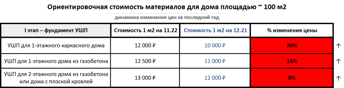 Открывая запись в график на 2023 год, мы, как обычно, проверили текущие цены на строительные материалы и посчитали примерную стоимость 1 квадратного метра для домов разных площадей. Процесс этот сложнее, чем может показаться, поскольку список материалов очень длинный и каждая позиция меняется по-своему. Отслеживать каждый пункт в режиме реального времени затруднительно, потому информация обновляется периодически. Используются эти цифры для формирования примерных расчётов стоимости дома, в ответ на поступающие запросы. Как вы знаете, стройку мы разбиваем на три основные этапа: То есть на I этапе делается фундамент, кстати это может быть и монолитная плита без тёплого пола, не обязательно УШП. Также стройка возможна и на готовом фундаменте, но основной наш профиль – это всё таки УШП, потому в данной заметке рассматривается именно такой вид фундамента. На II этапе стройки возводится т.н. «коробка под крышу», каркасная или из газобетона – самые востребованные варианты, хотя ещё мы пре