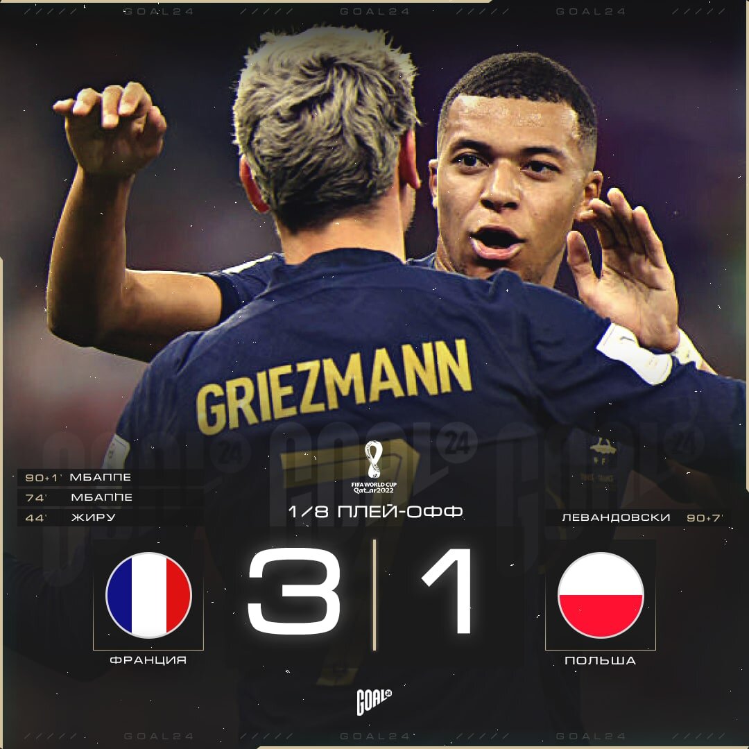 Как и предполагалось, для сборной Польши это будет последняя игра на ЧМ. Поляки с невнятной игрой вышли из группы, только по лучшей разнице забитых и пропущенных мячей. В первые минуты встречи они удивили своим высоким прессингом, почти весь первый тайм создавали опасные моменты у ворот Льориса, а не отсиживались в обороне. Но концовка первого тайма осталась за французами, им удалось открыть счет. После этого игра у поляков пропала и появится лишь в концовке матча. Второй тайм прошел под диктовку французов, они создавали моменты, даже в начале второго тайма смогли забить, но судья разглядел фол на вратаре и отменил гол. За 15 минут до конца матча, на сцену вышла звезда 🇲🇫 Мбаппе и оформил дубль, тем самым поставил жирную точку в матче. Оставался один вопрос, сможет ли капитан и звезда команды 🇮🇩 Левандовский забить? На 97 минуте назнается пенальти в ворота французов. Левандовский подошёл к мячу, но как и в игре с Мексикой пробил в правый угол от себя, вратарь🇲🇫 угадал и отбил