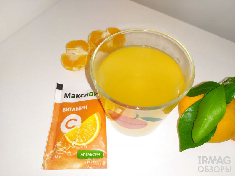 Обзор на Напиток Aveo Максивит Апельсин и витамин С Из путешествия в город на Вятке я привезла разочарование, пару серых фотографий и сезонную простуду. А также глубинный страх остаться без солнца. Представляете, в Кирове всего 75 солнечных дней в году. В наш солнечный Иркутск я вернулась с огромной радостью и потребностью напитаться витамином D. А также другими витаминами, ибо сопли никак не хотели покидать меня, а ночью они ещё и провоцировали чахоточный кашель. С кашлем я боролась при помощи сиропа с чабрецом (об этом можно прочитать здесь), а витамин С нашла на Ирмаге. 10 саше-пакетиков со вкусом апельсина от алтайского производителя МаксиВит. Каждый пакетик содержит 16г порошка, который при соединении с водой задорно шипит и превращает жидкость в апельсиновый витамин. По инструкции написано заливать содержимое пакетика горячей кипяченой водой, но мне больше пришелся по душе вариант с водой комнатной температуры или даже прохладнее, тогда по вкусу как летний освежающий джус) Вкус