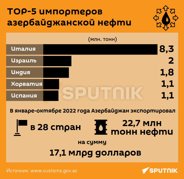 Добыча нефти и конденсата в Азербайджане в октябре 2022 года составила 663,8 тыс. баррелей в сутки. В январе-октябре 2022 года Азербайджан экспортировал в 28 стран более 22,7 млн тонн нефти на сумму свыше $17 млрд. При этом Италия стала крупнейшим импортером - в отчетный период Азербайджан экспортировал в эту страну 8,36 млн тонн нефти на $6,26 млрд. На втором месте - Израиль, который закупил более 2 млн тонн азербайджанской нефти на сумму $1,5 млрд. Третье место в списке импортеров заняла Индия. Азербайджан экспортировал в январе-октябре 2022 года в эту страну 1,8 млн тонн нефти на сумму $1,5 млрд.