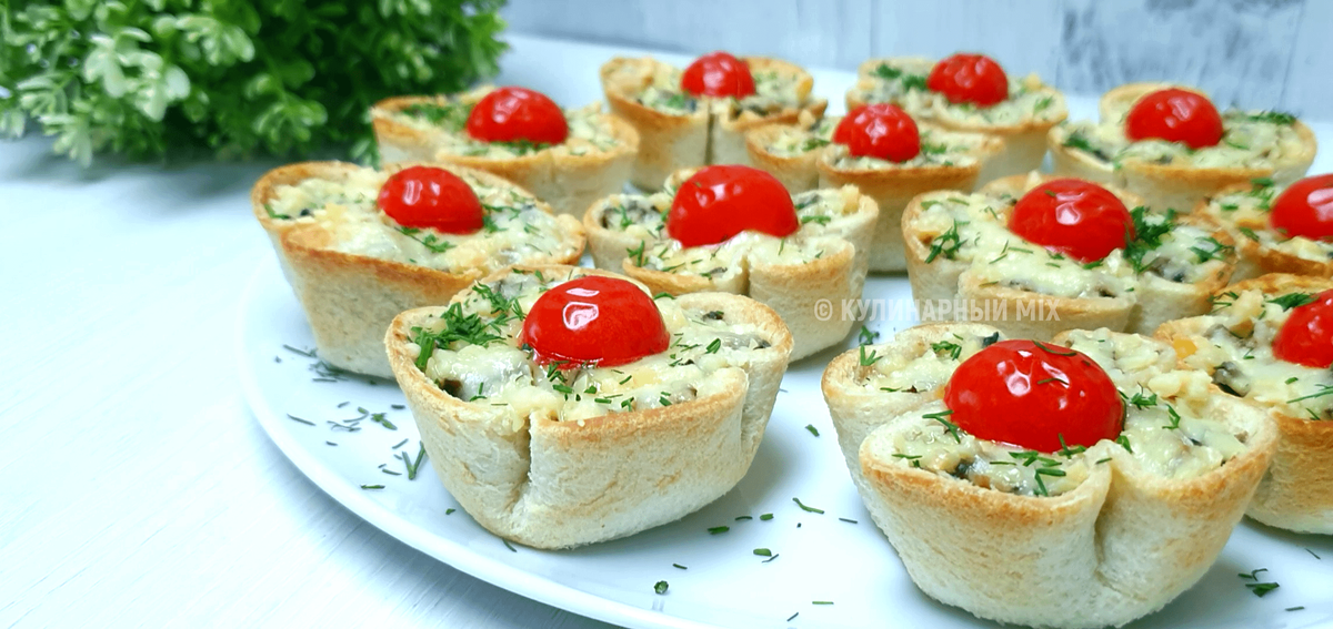 Оригинальная, яркая и очень вкусная закуска, которая станет украшением любого праздничного стола. Готовится все очень просто и быстро. КАК ГОТОВИТЬ: Шампиньоны нарезать кубиком и готовить на среднем огне, помешивая, пока не испарится жидкость. Репчатый лук мелко нарезать и добавить к грибам. Жарить до готовности лука. Посолить, поперчить, добавить мускатный орех, сушеные молотые грибы и сметану. Перемешать, потушить пару минут и начинка готова. Тостовый хлеб раскатать скалкой и вырезать кружочки диаметром 10 см. Получается 12 штук. В форму для кексов разложить кружочки из хлеба. Подсушить в духовке при 180 градусах 5 минут. Затем разложить в корзиночки грибную начинку. Сверху посыпать сыром и выложить по половинке помидоров черри. Запекать при 180 градусах около 10-12 минут. Достать из духовки, посыпать зеленью укропа и сразу же подать на стол. Подробности и детали приготовления можно посмотреть в коротеньком видео ниже: ⤵️⤵️⤵️ Рекомендую посмотреть: 👇 Подписывайтесь на канал «Ку