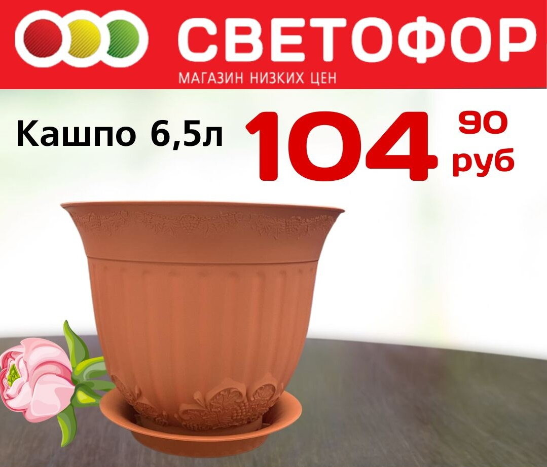 Всем привет! Сегодня в магазине Светофор в продаже есть кашпо для цветов с поддоном. Объем 6,5 литра. Производитель Россия. Цена 105 рублей. Капуста квашеная по- деревенски Традиции вкуса. 0,9 кг. Цена 76 рублей. Полусапоги утепленные, низкие, с меховой опушкой. Размеры с 41 по 45. Цена 822 рубля. Светильник потолочный 120 см. Мощность 40 Вт. 6500 К. Цена 248 рублей. Светодиодная лента с блоком питания для уличной подсветки. 10 м. Цена 965 рублей. Корзина для белья 48 л. Россия. Цена 378 руб. Миска эмаль. 2,5 л. Россия. Цена 297,30. Гирлянда светодиодная 10 метров, 100 ламп, 8 режимов. Цена 132,60 Лопата снеговая с металлической планкой, без черенка. Производство Россия. Цена 159 рублей. Гель для стирки белья 3 л. Цена 222,50 Икра лососевая 140 гр. цена 169,60 Коврик универсальный 7в 1. Удерживает влагу и грязь, легко чистить, не впитывает запахи, можно обрезать под нужный размер. Цена 299 рублей. Таз пластиковый круглый с ручками. 14 л. Россия. Цена 99 рублей. Жаровня с антипригарным