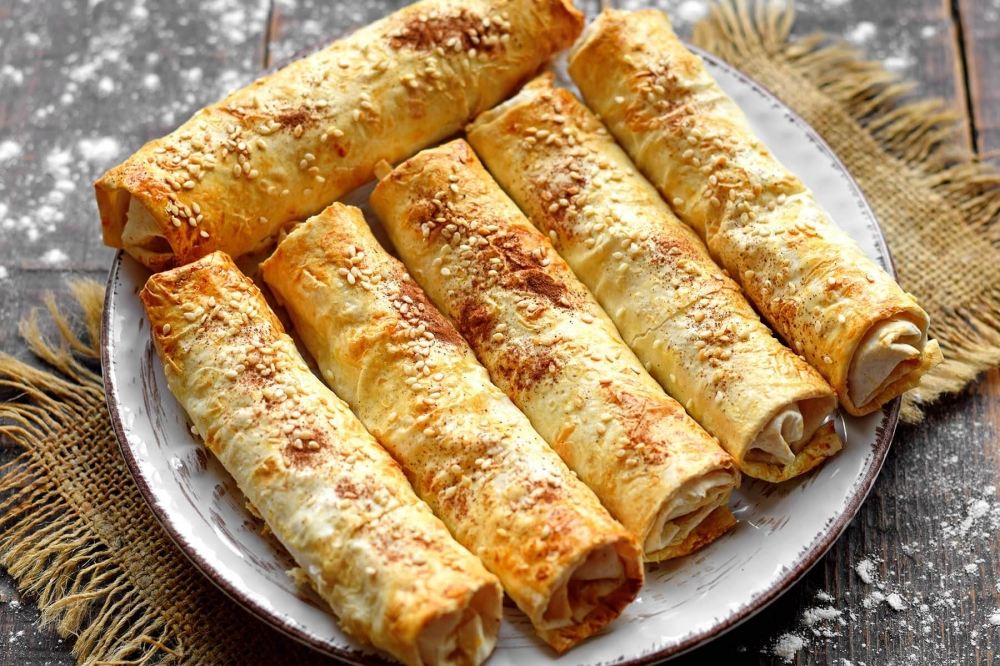 Выложите их на противень или в форму, смазанную сливочным маслом. Сверху трубочки также смажьте желтком, после присыпьте кунжутом и молотой корицей.