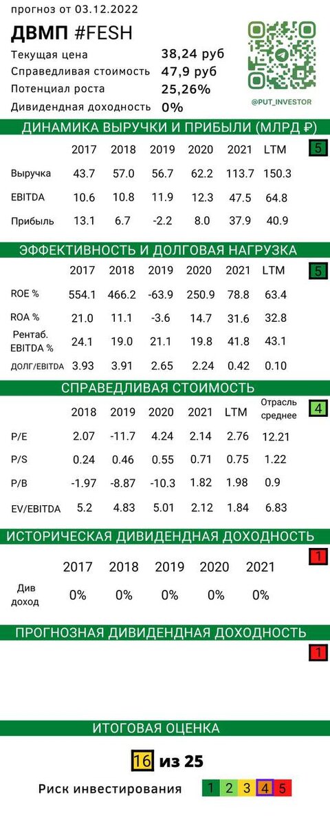 #FESH ДВМП (FESCO) - Российская транспортной-логистическая компания, лидер контейнерных перевозок между РФ и странами Азии по морскому пути и железнодорожному сообщению. Компания имеет собственный флот, контейнерный и автомобильный парк, железнодорожные составы, терминальные комплексы. Инвестиционная привлекательность: ✅За первое полугодие 2022г. Выручка компании увеличилась на 75% г/г, показатель EBITDA вырос на 125% до рекордных 38 млрд руб. Долг сократился с 19 до 9 млрд руб. компания показала редордные объемы перевозок по международным линиям из стран Азии в сторону Дальнего востока порядка 144 тыс TEU. ✅Диверсификация бизнеса одно из ключевых преимуществ ДВМП при негативных сценариях в одном сегменте бизнеса ее может нивелировать другой. За счет разнонаправленного развития бизнеса ДВМП остается менее подвержено рискам изменения цен. Компания инвестирует огромные деньги в модернизацию и обновление своего флота и парка, в 2022г. инвестиции составили 34 млрд руб. ✅