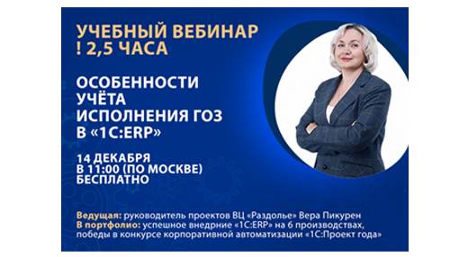 На вебинаре «Особенности учёта исполнения ГОЗ в «1С:ERP» руководитель проектов ВЦ «Раздолье» Вера Пикурен поделится опытом эффективного ведения учёта по гособоронзаказу и рассмотрит причины проблем, возникающих на предприятии при попытках автоматизировать ведение учёта и отчётности, связанных с ГОЗ.