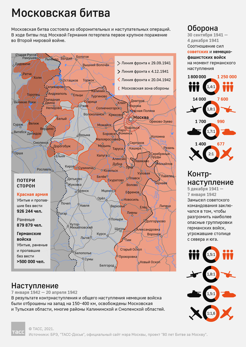 5 декабря 1941 года началось контрнаступление советских войск против немецко-фашистской армии в битве под Москвой. Сражение стало самым крупным за всю историю Великой Отечественной войны. В этот день ежегодно отмечают День воинской славы России. Германские войска начали наступление 30 сентября 1941 года. На тот момент силы сторон составляли 1,8 млн солдат немецко-фашистских войск и 1,25 млн советских. К ноябрю сохранялась тяжелая обстановка, противник близко подошел к Москве. 5 декабря советские войска перешли в контрнаступление. Замысел советского командования заключался в том, чтобы разгромить наиболее опасные группировки германских войск, угрожавшие столице с севера и юга. 7 января 1942 года Красная армия начала общее наступление. Под ее ударами немецко-фашистские войска постепенно вытеснялись на запад. В результате контрнаступления и общего наступления к 20 апреля войска противника были отброшены на запад на 150–400 км, освобождены Московская и Тульская области, многие районы Калин