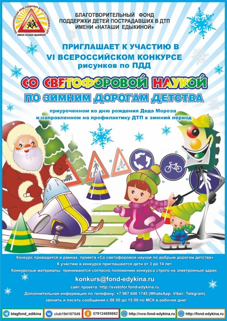 VI Всероссийский конкурс рисунков на тему правил дорожного движения «Со светофоровой наукой по зимним дорогам детства» приурочен к дню рождения Деда Мороза, который отмечается 18 ноября, и направлен на профилактику ДТП в зимний период. Конкурс проводит Благотворительный фонд поддержки детей, пострадавших в ДТП, имени Наташи Едыкиной. К участию приглашаются дети от трех до 14 лет. В работах должно быть отображено правильное поведение детей на дорогах зимой. Конкурсные материалы принимаются по электронной почте. Конкурс проводится в рамках проекта «Со светофоровой наукой по добрым дорогам детства». Дополнительную информацию можно получить по телефону +7 (967) 640-17-45 (WhatsApp; Viber;Telegram). Звонить и писать с 10:00 до 16:00 по московскому времени в рабочие дни. Благотворительный фонд поддержки детей имени Наташи Едыкиной оказывает помощь детям, пострадавшим в ДТП, занимается воспитанием общей культуры поведения участников дорожного движения. 0+ Брянцев приглашают поучаствовать в ко