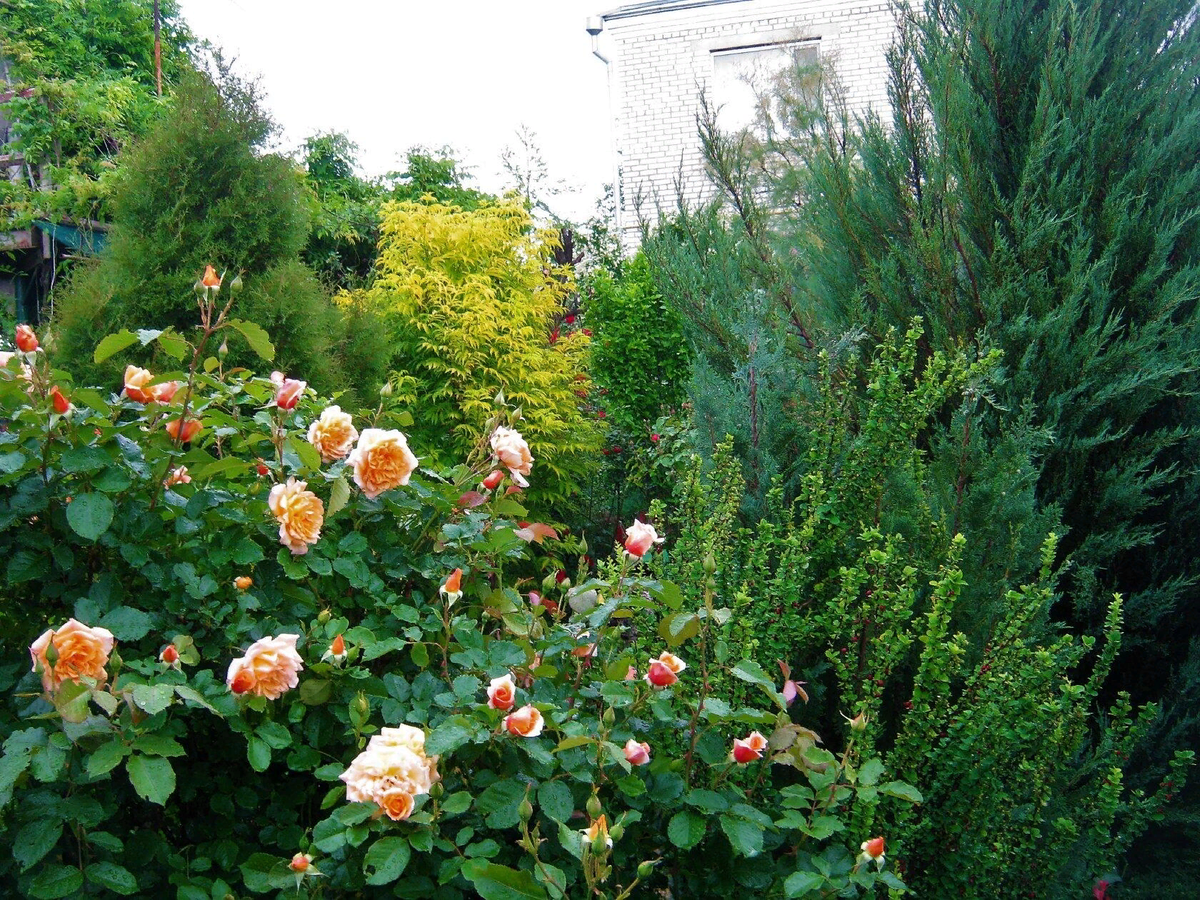 К лету 2020 года в саду уже буйство растений! Разрослось всё. Хвойные в это лето стригла бесконечно. И при этом очень сильно некоторые экземпляры. Разрослись и розы. А у меня между хвойных растут в основном большие плетистые розы. Напомню, что сад находится в Краснодарском крае. У нас в июне как раз пик цветения роз. На фото выше- 02.06.2020. РОЗА "МИШКА", БУЗИНА "ПЛЮМОЗА АУРЕА" , БАРБАРИС И МОЖЖЕВЕЛЬНИК "СКАЙРОКЕТ". 02.06.2020. РОЗЫ "РОЗАРИО" И " ИЛЗЕ КРОН СУПЕРИОР". .... 02.06.2020. ПУЗЫРЕПЛОДНИК И ЖАСМИН / ЧУБУШНИК. В июне цветут многие декоративные кустарники. 02.06.2020. БОРДЮР ИЗ ВЕРОНИКИ СЕДОЙ. У меня несколько сортов вероник. Рассадила их между роз. Именно с розами они красиво смотрятся. Рядом растёт розовая роза "Корал Дон". 02.06.2020. РОЗА "ФЛАМЕНТАНЦ" , БЕРЕСКЛЕТ "ЭМЕРАЛЬД ГОЛД" И МОЖЖЕВЕЛЬНИК КАЗАЦКИЙ "МАС". Бересклет подвязываю на опоры вместе с розой. 02.06.2020. РОЗЫ "ФЛАМЕНТАНЦ" И "ФРАНКОИС ЮРЕНВИЛЬ" НА ПЕРГОЛЕ. ЖЁЛТЫЙ БЕРЕСКЛЕТ "ЭМЕРАЛЬД