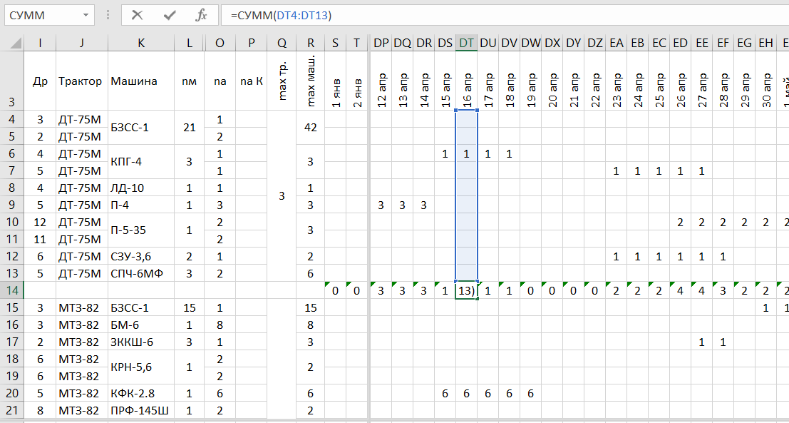 Для начала под каждым трактором в графике создаём новую строчку, и в теле календаря суммируем числа агрегатов с этим трактором на каждый день: