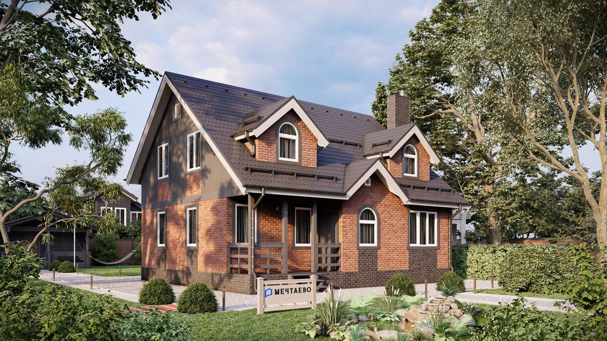 Альпину можно назвать настоящим классическим проектом – нейтральные темные оттенки фасадных панелей, двускатная кровля с слуховыми окнами, арочные окна и настоящая эркерная беседка с выходом из гостиной. Так что такой дом точно подойдет любителям сбалансированной и «спокойной» архитектуры.