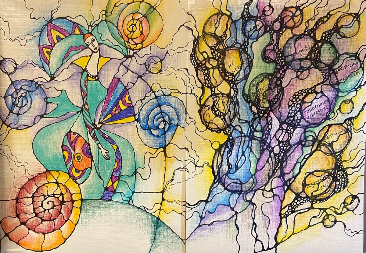 "Делюсь с радостью сегодняшним волшебством. Решила повесить рядом две моих картинки - очень важных для меня. И каково же было мое удивление, когда линии на краях рисунка совпали!!!! Я аж застыла. Правда, две линии пришлось продолжить. Но чудеса!!!! Душа ликует!!!! 💃"