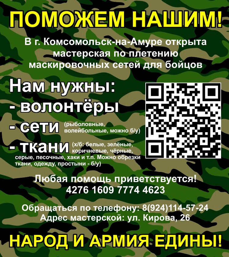 В Комсомольске-на-Амуре, как и во многих регионах России, граждане самоорганизовались для плетения маcкиpoвочных сетей для нужд СBО. Оказалось, что это очень востребовано нашими бoйцами. Материал – ткани и рыболовные сети приносят сами горожане. Плетение маскировочных сетей – дело не сложное. Справиться с ним может любой – и взрослый, и ребёнок, и женщина, и мужчина. Маcкиpовочная сеть – вещь дефицитная и быстро расходуемая, так что работы – МНОГО. Приходить можно хоть каждый день, в том числе в выходные. Мастерская открыта с 11 утра. Приглашаем волонтёров – приходите сами, приводите своих друзей. Также необходим расходный материал. Подойдут как цельные, так и небольшие отрезки ткани. Если кто-то готов оказать финансовую помощь для приобретения материалов, то в назначении платежа обязательно пишите: добровольное пожертвование. Номер карты для поддержки: 4276 1609 7774 4623 (Сбербанк). Заранее благодарим! Городское общественное движение «Сила народа», г. Комсомольск-на-Амуре