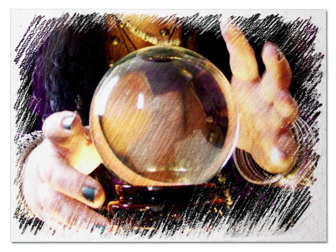Вот и Алису усадила за стол, покрытый черной скатертью, в центре которого стоял хрустальный… а точнее — стеклянный и местами солидно так сколотый шар.