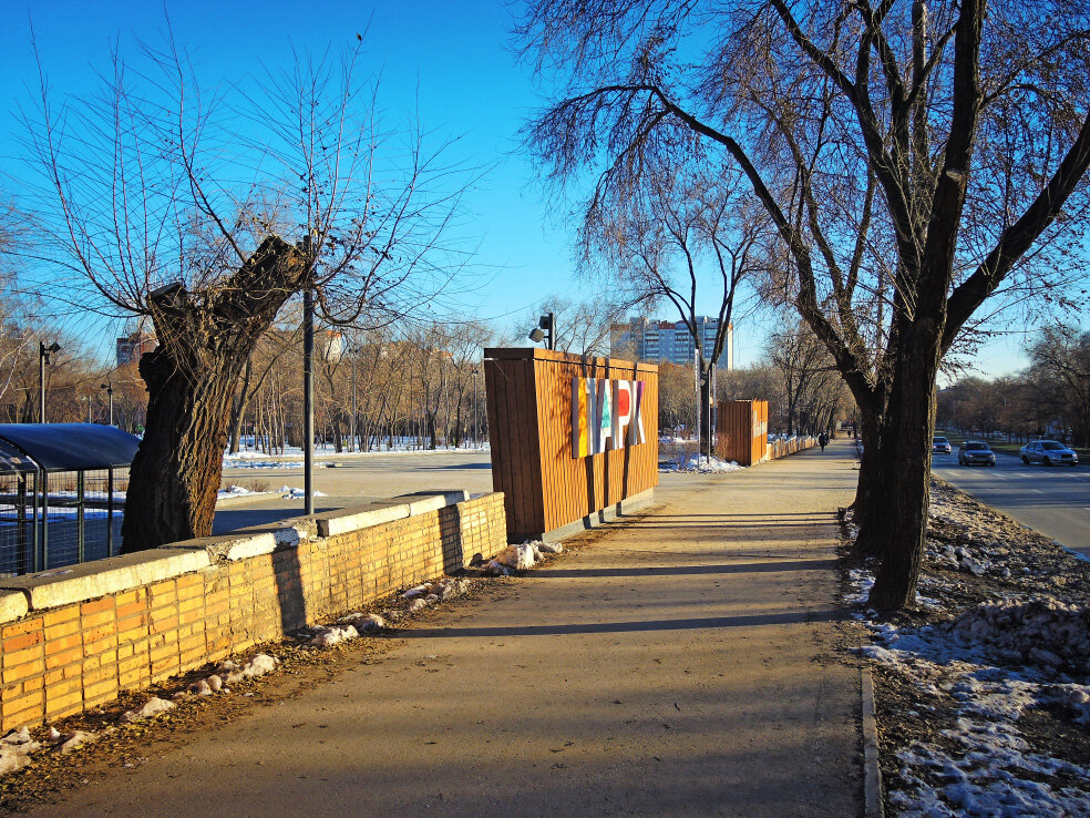 Приглашаю на очередную фотопрогулку по Самаре. В этот раз мы пройдёмся по уже почти зимнему Молодёжному парку. В конце октября здесь был закончен первый этап реконструкции. Чтобы посмотреть на результаты, ждал подходящей погоды. Дождался только в конце ноября. Конечно, оценить полную картину можно будет только летом, когда станут видны все дорожки и клумбы. Но и со снежком и льдом уже понятно, что получилось очень интересно. Для сравнения, вот как парк выглядел весной, до реконструкции. Там же можно почитать краткую историю места. Реконструкция на данный момент коснулась части парка от улицы Ново-Вокзальной до озера. В этой подборке мы посмотрим центральную аллею на этом участке. Общее ограждение территории парка пока осталось старым. Но входную группу сделали полностью новой. Около входа установлены информационные таблички со схемами парка. Одна - общая, которая показывает весь проект. Вторая - только обновлённой части. Общий проект кто-то невероятно важный утвердил своей подписью. Бе