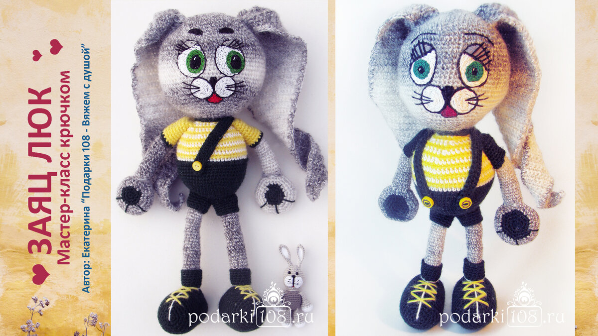 Привет. Хочу поделиться своим текстовым Мастер-классом Зайчика крючком. Заяц ЛЮК у меня получился около 40 см. Все зависит от толщины пряжи и плотности вязания. Подробнее в МК. Вязать можно из любой пряжи. Возьмите подходящий к своей пряже крючок.