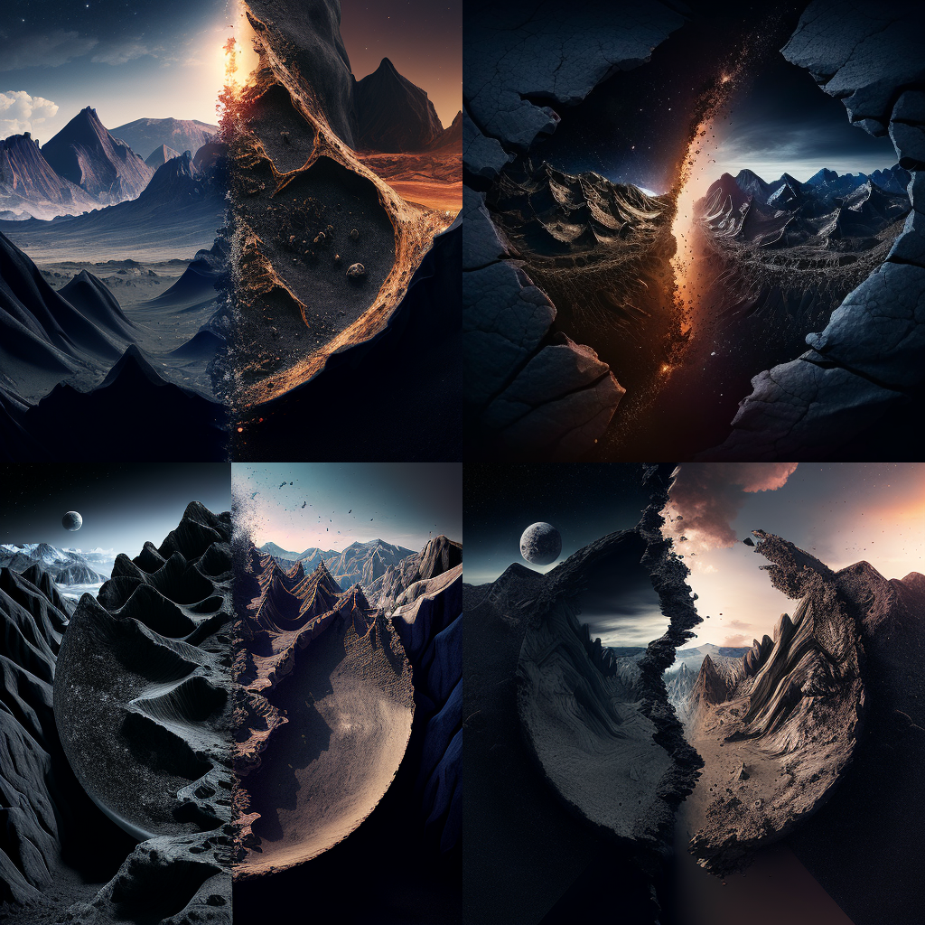 Как говорится – не все коту масленица. Я на собственном опыте убедился, что нейросеть на данном этапе неидеально рисует нестандартные вещи. То, что редко встречается в запросах пользователей. Неважно рисует технику, особенно выдуманную. Города, которые никто и никогда не видел и которые существуют только в воображении автора. В качестве источника для образов и запросов я выбрал как всегда свою книгу. Для начала мне захотелось, чтобы нейросеть нарисовала мне планету пережившую глобальный катаклизм. У планеты отсутствует северное полушарие. Вместе него хаос из астероидов. Южное осталось целым. Сохраняется (благодаря определенной технологии) атмосфера и жизнь. По линии разлома стена из черных и неприступных гор. Миссия для нейросети невыполнимая. Получив превью, я не стал больше ее мучать. Стоит заметить, что картинки вышли довольно-таки интересные, но сути они не смогли передать. С самой черной стеной вышло лучше. Первое превью получилось красивым, но мне хотелось, чтобы горы не прерывал