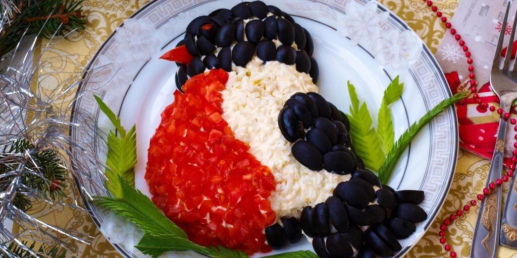 1. Салат «Снегирь» с курицей и рисом Ингредиенты Приготовление Яйца отварите вкрутую за 10 минут, рис и филе — до готовности. Куриное мясо, лук, помидоры и маслины нарежьте небольшими кусочками. Белки и желтки по отдельности натрите на крупной или средней тёрке. Поместите на плоскую тарелку рис так, чтобы получились очертания снегиря, и смажьте майонезом. Дальше выложите курицу, лук, желтки и белки. После каждого слоя, кроме белкового, смазывайте соусом. Из помидоров выложите грудку и клюв снегиря, из маслин — голову, крылья и хвост. Из лука сделайте веточки. 2. Сырный салат с крабовыми палочками в апельсине Ингредиенты Приготовление Отварите яйца вкрутую за 10 минут. Куриную грудку нарежьте плоскими ломтиками среднего размера и посолите. В сковороде разогрейте масло на умеренном огне. Обжарьте курицу примерно за 15 минут, выложите на тарелку и остудите. Нарежьте маленькими кусочками вместе с яйцами и крабовыми палочками. Орехи измельчите. Сыр натрите на мелкой или средней тёрке. Апел