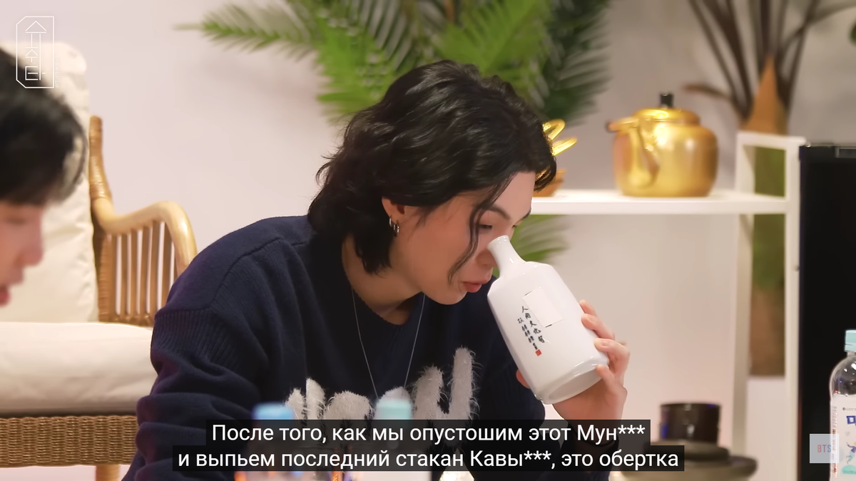 Да, мужчины могут расслабиться и поговорить по душам только за чашкой > чем 40' алкоголя... Мне алкоголь ни к чему-я рыдаю от одного только вида и голоса этого спокойного очаровательного мужчины с длинными густыми волосами, удивительно аристократичными манерами и офигенным переполняющим его чувством собственного достоинства... Сидит такой красивый, очень нежный, расслабленный, ждёт гостя, и типа-не в курсе,что к нему придёт РМ... Ага... Намджун ужасно шумный, словоохотливый, болтливый даже- так очевидно, что его переполняют мысли, эмоции, впечатления... Он просто ЖАЖДЕТ донести прежде всего до АРМИ свои новые ощущения от так вдруг открывшейся свободы, и заодно объяснить себе своё нынешнее состояние и оправдать всё, что сейчас происходит... Не всегда уверен, как всегда-самокритичен, и абсолютно заметно, как ему важно мнение Шуги... У них довольно своеобразные отношения- Наму ищет взгляд Юнги, а тот словно отстраняясь слушает взволнованного собрата, порой даже не глядя в его сторону, н