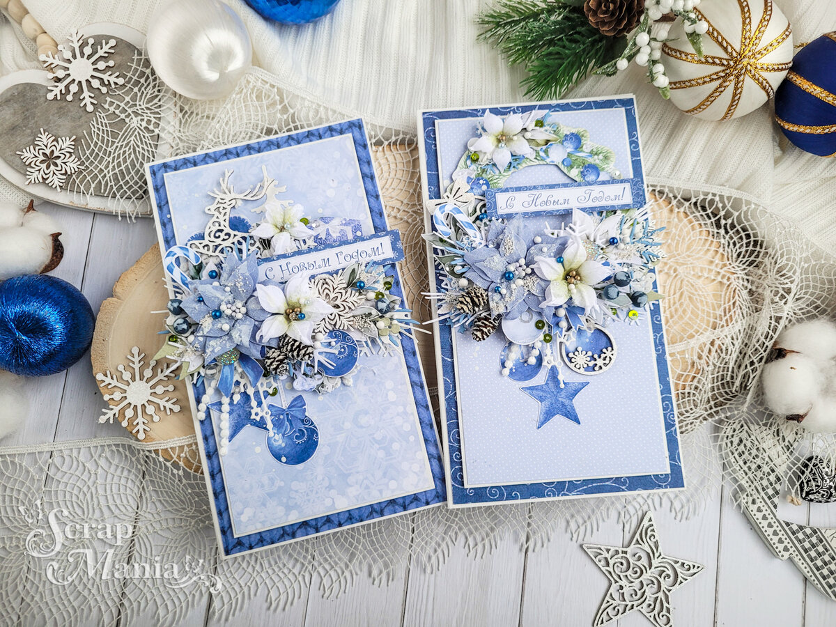 Вся информация по проекту находится в теме в группе вКонтакте, там же можете задавать интересующие вас вопросы. Дорогие любители теплых открыток, мы рады объявить о начале четвертого этапа! И вдохновлять вас сегодня буду я, Elena Veres. На этом этапе я создала новогодние открытки из зимней новинки этого года - коллекции "Волшебный снегопад". Эта коллекция как нельзя лучше отражает тему последнего этапа "Зимняя сказка" и содержит много всевозможных милых зверюшек, чудесных птичек и новогодних игрушек. Это наш первый обязательный элемент. Для открыток я выбрала яркие синие елочные шары и другие новогодние украшения из листа с картинками и скрап-карты. Второй обязательный элемент - вырубка. Ее я сделала с помощью ножей "Веточка остролиста с ягодами", "Снежинка 1", "Снежинка 2", "Этника новогодняя. Снежинка", "Листья космеи", "Снежная клюква". На этом этапе я выбрала синее цветовое решение. Синие елочные шары, ярко-синие банты, синее сердечко с имитацией строчки, полосатый сине-белый л