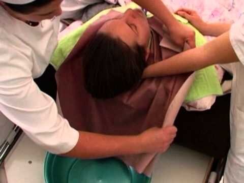 Как правило, лежачий больной сам не может ухаживать за своими волосами: мыть их и расчёсывать. Ему нужна помощь. Если этого не делать, волосы спутываются, быстро загрязняются, выглядят неопрятными. Обратите внимание, чтобы у расчёски зубцы были редкими и не острыми. Такой расчёской легче расчёсывать спутанные волосы и она не поранит кожу головы. Легче расчёсывать волосы, когда больной сидит. Перед расчёсыванием нужно покрыть плечи полотенцем или пелёнкой и проверить, нет ли в волосах шпилек или заколок. Расчёсывать волосы необходимо медленно и осторожно, начиная с концов, постепенно продвигаясь к корням волос. Лежачему пациенту нужно повернуть голову в одну сторону, расчесать половину, затем повернуть в другую сторону, расчесать другую половину волос. Расчёсывать волосы необходимо ежедневно, моют голову 1 раз в 5-7 дней. Перед мытьём волосы обязательно расчёсываем, чтобы они лучше промывались. Для мытья головы в постели приготовим: перчатки, фартук, две клеёнки, таз, кувшин с тёплой во