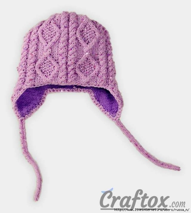 Вязание осуществляется по схеме узора. Сначала необходимо связать 2 ушка. Для этого набрать 6 п. и вязать по схеме, прибавляя по 2 п. в каждом 2-ом ряду 9 раз = 24 п. В итоге будет провязано 22 ряда. Отложить петли одного ушка и таким же образом вязать второе. Далее соединить все петли след. образом: 24 п. первого ушка, набрать 24 п. для задней части шапки, 24 п. второго ушка и набрать 48 п. передней части шапки = 120 п. Замкнуть петли в кольцо, продолжить вязание по схеме на высоту 18 см, т.е. выполнить 64 круга. Для подклада набрать для ушка нитью без пайеток 3 п. и вязать лицевой гладью, выполняя прибавления в каждом 2-ом ряду в начале и в конце ряда по 1 п. 7 раз = 17 п. Провязат