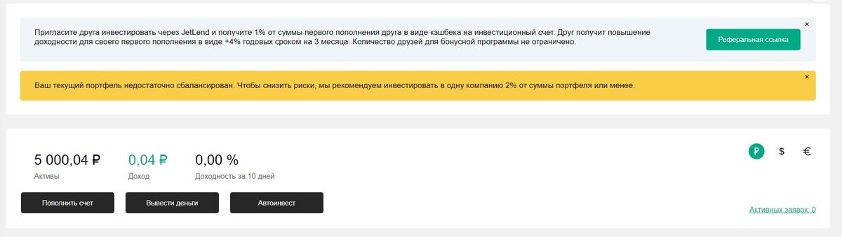 Поток.Диджитал дело хорошее. АльфаБанк из него вышел, а МосБиржа вошла. Информация вроде точная. В любом случае там сейчас крутятся 30 тыров на трёх счетах. Крутятся и крутятся. Общий ожидаемый доход со всех счетов примерно 400р в месяц. Или 4800 в год. Первый шаг сделан. А сколько их впереди ещё.... В общем 26 ноября я запустил новыйстарый проект. Ну как запустил. Когда писал ту статью, я только зарегистрировался на jetlend.ru. Это была информация для затравки. Теперь же все необходимые бюрократии завершены. Автоматика запущена. Стартовая сумма введена. 1500+1500+2000 р. Автоинвестирование ещё требует донастроек с моей стороны. Что я точно могу сказать, то ожидаемый возврат средств (+процент) на данный момент примерно 80р в месяц, эта сумма меня совершенно не устраивает. Хочу чтобы в месяц прилетало хотя бы на +1 инвестицию. Пообщался с техподдержкой, диверсификация ещё пару недель будет длиться. Ну, а с учетом того, что планирую ещё заводить средства, то процесс может и затянуться