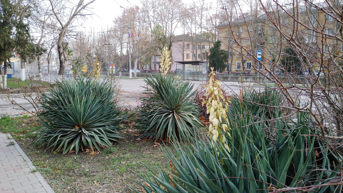 В этом году на полуострове зимнее цветение юкки - особенное пышное и обильное. Её огромные белые цветоносы мелькают повсюду. И на улицах города, и в дачном посёлке. Мне кажется, летом юкка цвела не так пышно. В декабре она устроила просто зимний цветочный балл. Растение это - на самом деле не эндемик. В Крыму юкка появилась впервые менее ста лет назад. В 30-е годы прошлого века это растение заморской диковинкой прибыло в Никитский ботанический сад из Северной Америки. Её родина - пустынные области Мексики и США. Именно там произрастает множество видов юкки. Некоторые из них могут достигать гигантских размеров. Вот это, например, тоже она: Кстати, благодаря юкке появились первые джинсы. Их ткань изначально изготовлялась именно из её волокон. Эти волокна придавали изделию особую прочность. Такие «юкковые» штаны были столь долговечны, что даже передавались по наследству. В определённый момент, популярность джинсов так выросла, что юкк стало не хватать. Пришлось в волокно добавить хлопок,