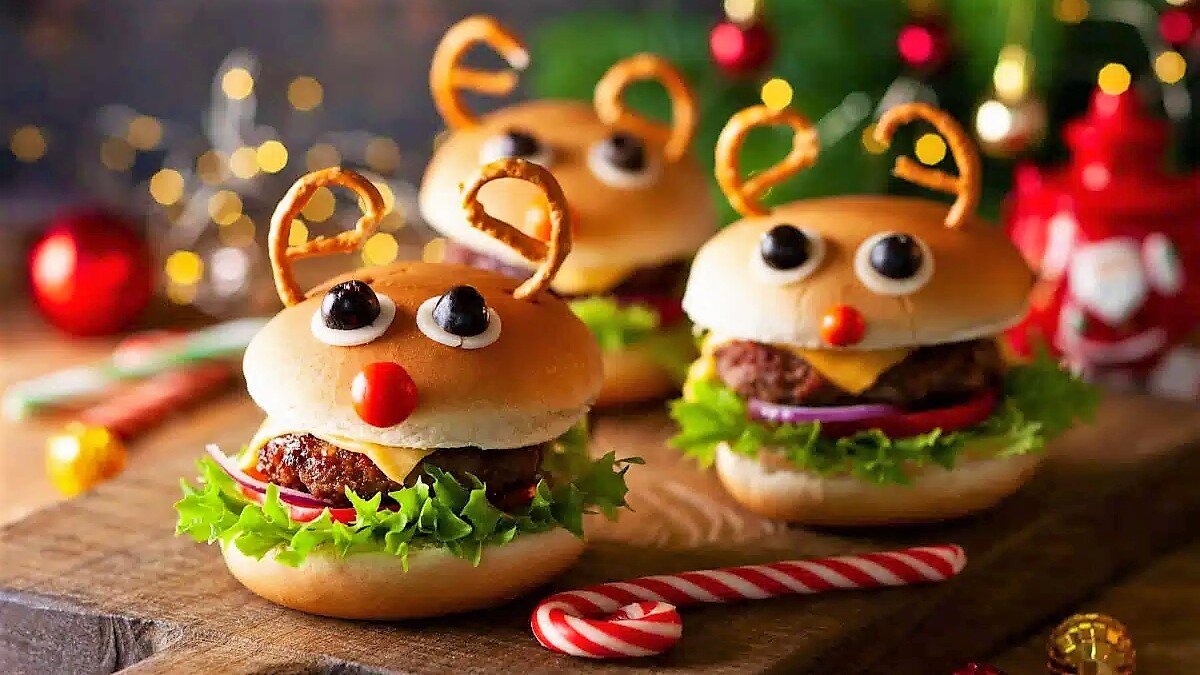 Классика и простота? Эти гамбургеры идеально подходят для Нового года и Рождества. Сладкие гамбургеры с рогами из кренделя легко могут быть северными оленями на столе и имеют потрясающий вкус. Время приготовления: 15 мин. Пошаговый рецепт: Порадуйте детей новогодними гамбургерами: ШАГ 1: Разрежьте булочки для гамбургеров и поджарьте их на гриле до хрустящей корочки. ШАГ 2: Нарежьте помидоры. Лук нарежьте полосками. Мини-моцареллу нарежьте ломтиками. Разрежьте пополам черные оливки и помидоры черри. ШАГ 3: Смажьте внутреннюю часть булочек для гамбургеров соусом для гамбургеров. Выложите листья салата. ШАГ 4: Сверху выложите рубленые котлеты, ломтики сыра, лук и ломтики помидоров. ШАГ 5: Сверху распределите кетчуп и положите верхнюю половину булочек для гамбургеров. ШАГ 6: На зубочистки вместо глаз прикрепите два мини-ломтика моцареллы с половинками оливок, а половинку помидора черри закрепите на булочке в качестве носа. ШАГ 7: Разрежьте мини-крендельки пополам и прикрепите их поверх бу