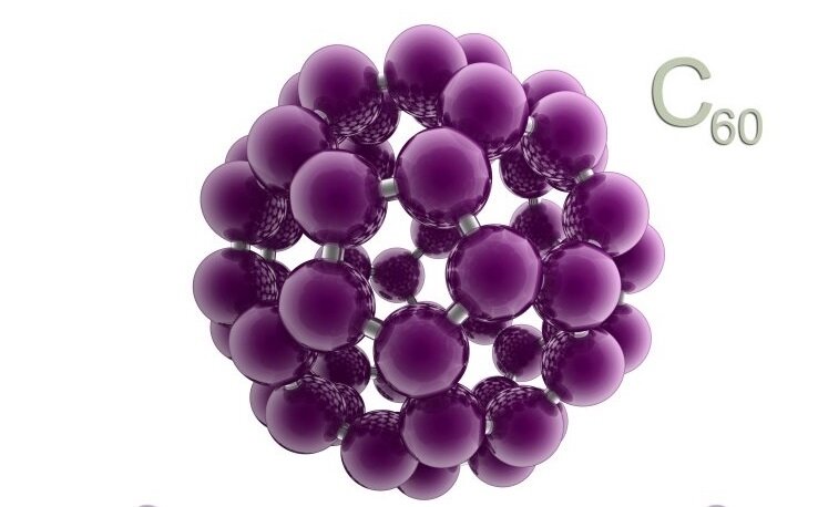 Фуллерены С60 это молекулы из шестидесяти атомов углерода, имеющие сферическую форму, похожую на футбольный мяч. В природе фуллерены содержатся в шунгите и морском воздухе. Фуллерен, в отличие от известных ранее форм углерода, растворим в органических растворителях (бензол, гексан, сероуглерод). В воде образует гидратированную форму, придавая ей красивый фиолетовый оттенок. Чем выше концентрация Фуллеренов, тем интенсивнее фиолетовая окраска. Из растворов и гидратов фуллерен легко кристаллизуется в виде мелких тёмно-коричневых и черных И кристаллов, похожих на хлопья сажи. Именно фуллерены С60 образуют такие хлопья в нашем Золотом Эликсире и Кремниевой воде. За открытие фуллеренов Г. Крото, Р. Смолли и Р. Кёрлу в 1996 году была присуждена Нобелевская премия по химии. (Подробное описание открытя) На Земле фуллерены образуются при горении природного газа и разряде молнии. Технология производства нашего Нано-золота и Биокремния обеспечивает образование высокой концентрации растворённых в