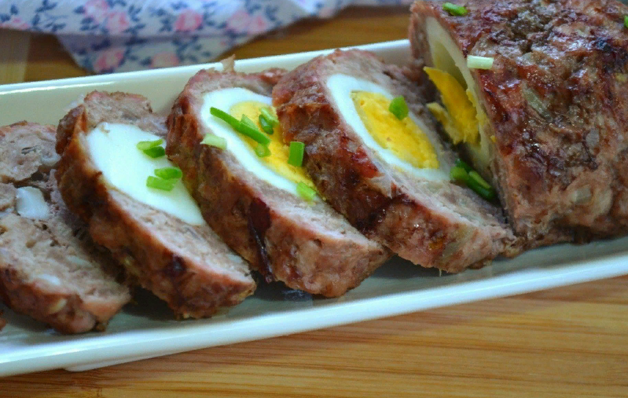 1.Ветчину мелко ножом на доске рубим или пропускаем через мясорубку, смешиваем с фаршем, в который уже предварительно добавили хлеб, свежие яйца, ошпаренный зеленый горошек и рубленая зелень.Все солим, перчим и тщательно вымешиваем. 2.Выкладываем в застеленную пергаментом форму.В середину батона вдавливаем вареные яйца, поверхность разравниваем.Запекаем в прогретой духовке при 190 С 30 минут. 3.При подаче посыпаем нарезанной соломкой морковью и сладким перцем и украшаем дольками помидор.
