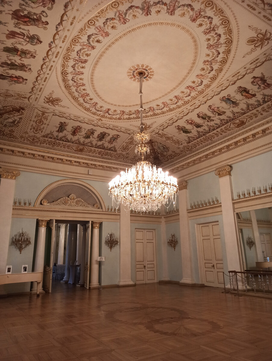 Забегаем в великолепный Танцевальный зал, в котором когда-то танцевала императрица Александра Федоровна. Ну и не только она, конечно: Юсуповы славились своими роскошными балами. Зал выполнен в стиле Классицизм. Нежно-голубые стены разделяются пилястрами из искусственного мрамора, а потолок расписан хороводами амуров и танцующими нимфами в цветочных гирляндах.