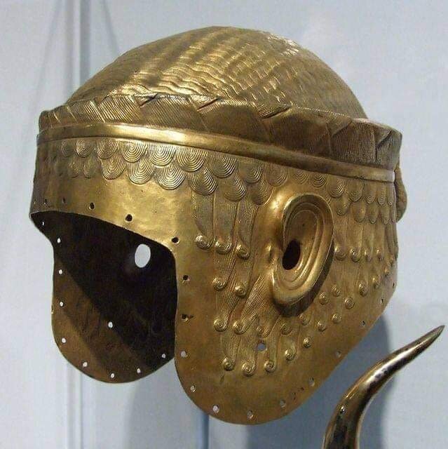 Издавна мужчины стремились уберечь он механических повреждений самое ценное их достоинство, которое, как вы знаете, бывает крупным и не очень... и скрывается в черепной коробке. Я про мозг, если что. Башка мужику важна и беречь её надо! Украшения, конечно, приятны, но надо удовлетворить любопытство и мужской аудитории, поэтому приходится балансировать в разных темах. 1) Золотой боевой шлем, принадлежавший шумерскому царю Мескаламдугу (один из первый царей города-государства Ур, что в Месопотамии), датируемый 2600 годом до нашей эры. Найден в царской гробнице в городе Ур на юге Ирака. 2) Греческий шлем фракийского типа IV века до н. э. Идеальный "сохран". 3) Самнитский бронзовый шлем ("халкидский" тип) и защита для шеи, 450 г. до н. э. Самниты - один из италийских народов древности, вначале они выпилили этрусков, а потом отхватили от Римской республики и исчезли, как самостоятельное государство. 4) Парадный золоченый шлем римского военачальника IV-го века. 5) На бога надейся, а сам не п