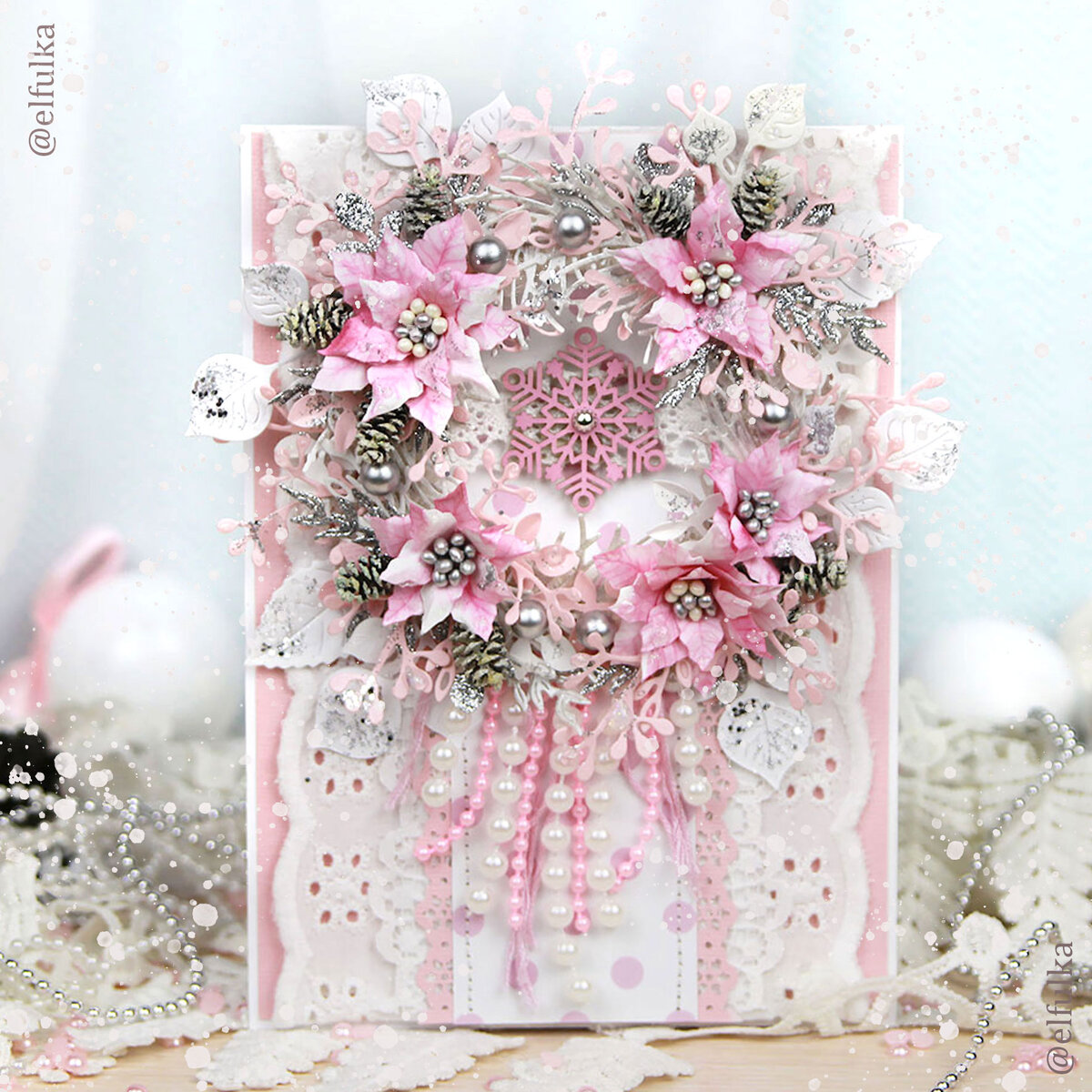 Доброго времени суток, мои творческие друзья и гости канала! Рада, что вы заглянули ко мне в гости)) Надеюсь, что просмотр этой работы подарит вам положительные эмоции, перенесет в зимнюю сказку и хоть немного отвлечет от забот и хлопот✨ Представленная открытка выполнена в нежной цветовой гамме: белый, розовый, серый (серебро). Эти оттенки не являются классикой новогодней палитры, но мне очень нравятся работы в нежных цветах. Размер открыточки 18 х13см Основа из дизайнерского картона (плотность 200гр/м2). Открытка многослойная. Фон выполнен из сочетания нескольких видов материалов: розовый кардсток, бумага для скрапбукинга, шитье и кружево. Центральный элемент здесь праздничный веночек, который собран из большого количестве декоративных элементов. Среди низ цветочки ручной работы, заснеженные шишки, бусины, разнообразны жемчужные нити, ажурные веточки и листики. А в центре веночка ажурная снежинка (чипборд). Цветочная композиция украшена глиттером, поэтому открытка еще и красиво перел