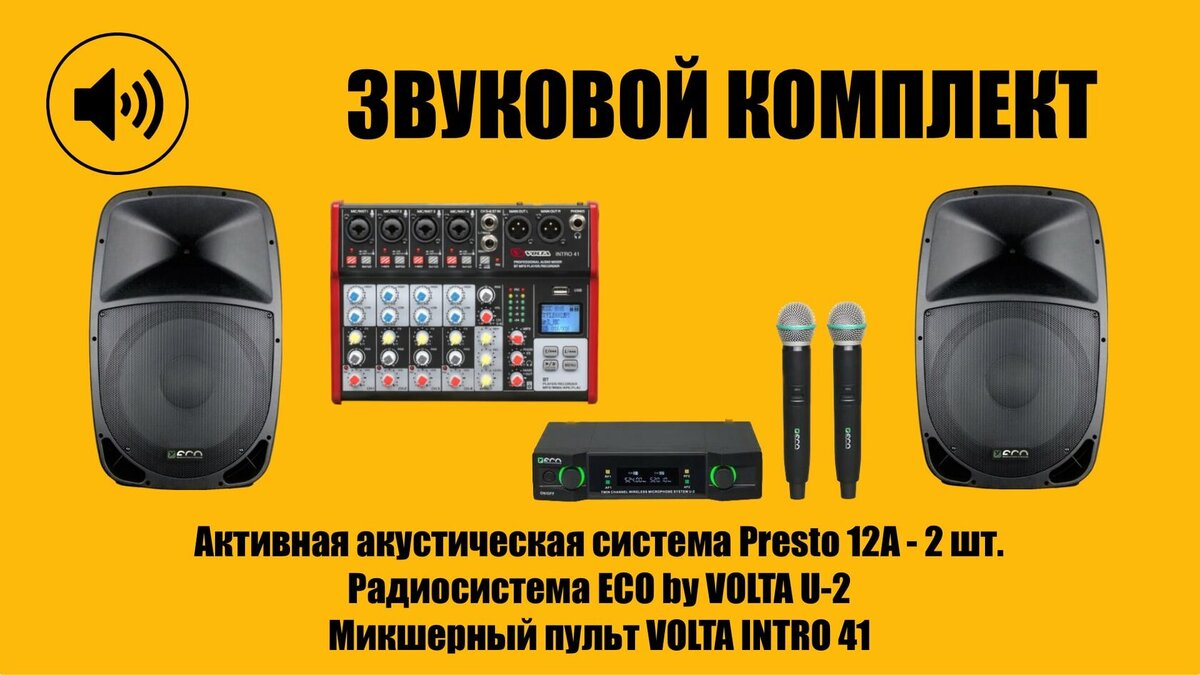 Комплект включает в себя 2 активные акустические системы, микшерный пульт и радиосистему с 2-я микрофонами. 1. Активные акустические системы 2 шт. ECO PRESTO-12A Активная акустическая система. Мощность (RMS) – 250 Вт, max – 500 Вт. Кофигурация: 12″ + 1.75″, 2 микрофона 2. Микшерный пульт с функцией рекордера и плеера 1 шт. VOLTA INTRO 41 Профессиональный компактный микшерный пульт. 4 миклинейных входа + 1 стерео. USB, Bluetooth, mp3. Запись микса mp3 на флешку. 3. Радиоисистема с двумя ручными микрофонами 1 шт. ECO by VOLTA U-2 (490.21/629.40) Микрофонная радиосистема с двумя ручными микрофонами При условии приобретении всего оборудования комплектом коммутацию для соединения микшера с акустическими системами мы изготовим вам в подарок.