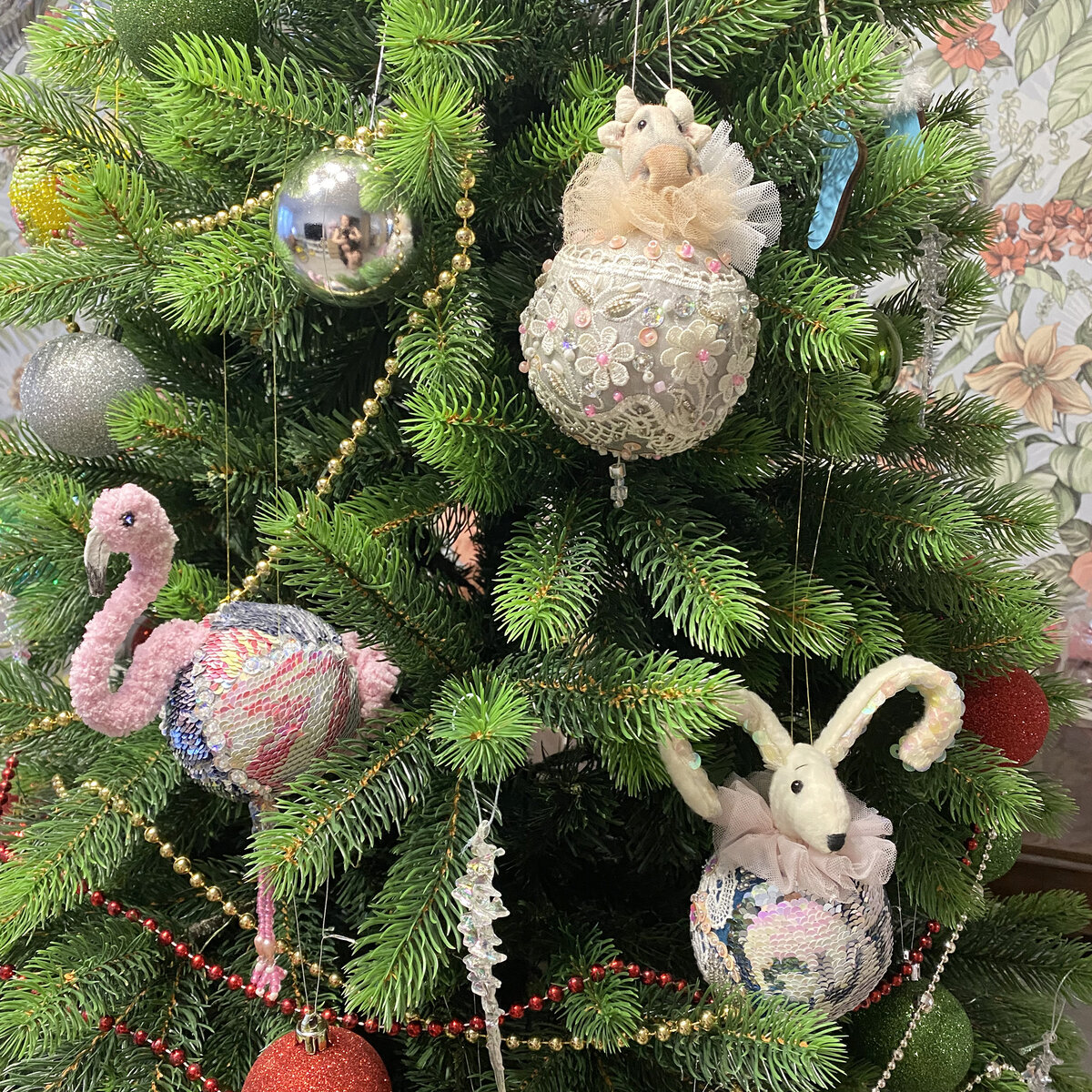 Творчеством я занимаюсь почти 8 лет, а елочные шарики придумала шить 4 года назад. Очень удачная была идея. Не бьются. Поскольку все шарики разные, то шить не надоедает. А самое главное- не купили в этом году, купят в следующем. Только голову поменять и новый символ готов. Но такого не бывает. Первый персонаж была мышка. Корона на голове и хвостик-бусинки. Первый год были эксперименты: разная фактура ткани(мешковина), бусины и пуговицы, блеск невозможный. Потом бала корова или бык. Мешковина исчезла. Золота довольно много. Коров и быков было много. Больше 40 штук. Год тигра мизерное количество шаров. Я занималась американской площадкой, там другие подарки и украшения. Даже дочке тигро-шар не достался. Нужно исправить. Я каждый год оставляю себе и дочке символы года. И вот год кролика грядёт. Вымучиваю шары и ворчу, что это бы последний шар символ года. Но нет. Беру свои слова обратно. Дочка нарядила у себя ёлку. По понятным причинам там только самые небьющиеся и мои шарики. Они пре