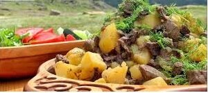 Куурдак — традиционное жаркое у киргизов, казахов, узбеков, карачаевцев и туркменов из мяса или субпродуктов и лука. Название происходит от киргизского слова кууруу, казахского куыру или узбекского слова qovurish, что значит жарка. Рецепт. Чтобы приготовить куырдак с картофелем, нужно сначала растопить жир, потом поочередно хорошо прожарить все субпродукты. Потом жарим все вместе с луком, тушим с бульоном и тушим с картофелем. Ингредиенты блюда: Легкое говяжье 1 шт. Лук2 шт. Картофель 4 шт. Курдючное сало 200 г Лавровый лист 2 шт. Соль по вкусу Сердце говяжье1/2 шт. Печень говяжья1/2 шт. Говяжий бульон 2 стакана Перец по вкусу Зелень по вкусу Шаг 1: Нарезаем мясо,картошку и лук мелкими кубиками. Курдюк тоже измельчаем. Шаг 2: Растапливаем жир, избавляемся от шварок. Шаг 3: По очереди жарим в казане легкое 15 минут, потом сердце 15 минут, потом печень 10 ми