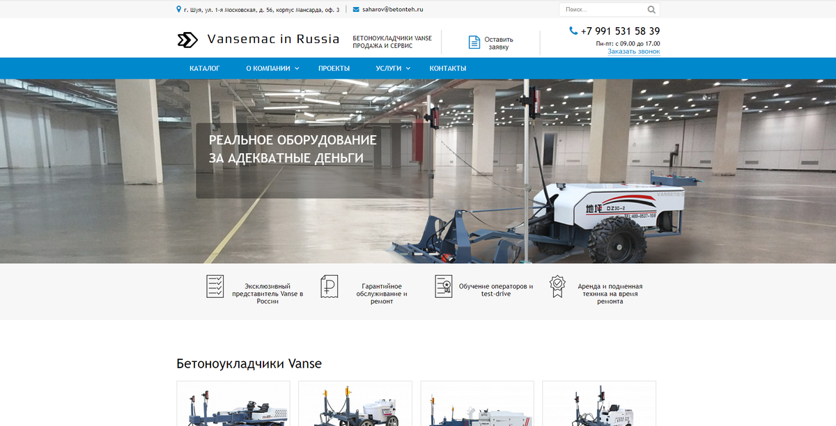 О клиенте Компания «Vansemac in Russia» является эксклюзивным представителем компании VANSE (SHANDONG VANSE MACHINERY TECHNOLOGY CO., LTD) в России. Китайская компания SHANDONG VANSE MACHINERY TECHNOLOGY CO., LTD – ведущий производитель бетоноукладчиков с использованием лазерной системы управления рабочим блоком в Китае. Ситуация на момент обращения Клиент планировал открыть и развивать новое направление по продаже и сервисному обслуживанию в России китайских бетоноукладчиков с использованием лазерной системы управления. Сайта у клиента не было. Он хотел открыть интернет-представительство и обеспечить привлечение на сайт ЦА, заинтересованной в аренде или покупке бетоноукладчиков Задача Разработать корпоративный сайт, позволяющий наглядно и быстро рассказать о продукции компании, а также привлечь ЦА - покупателей бетоноукладчиков. Что сделали 1. Создание адаптивного сайта на платформе 1С-Битрикс Мы сделали выбор в пользу понятной и гибкой платформы 1С-Битрикс. Благодаря ей легко поддерж