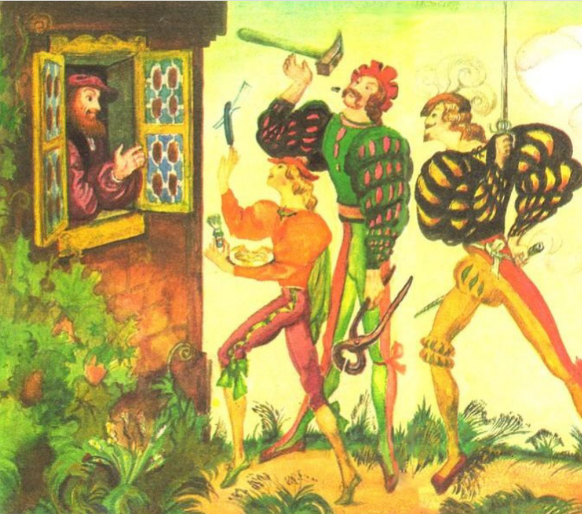 Много лет тому назад жил на свете отец с тремя сыновьями. Выросли сыновья молодцами, один другого лучше. Вот и говорит им отец: — Ступайте, дети, по белу свету странствовать, людей посмотрите и какому-нибудь делу научитесь. Тому из вас, кто самым лучшим мастером вернется, я свой дом оставлю. Пошли братья странствовать. Три года бродили они по чужим краям, а через три года вернулись все в один день домой к отцу. — Здравствуй, отец, — говорят они. — Здравствуйте, дети, — отвечает отец. — Ну что, научились чему-нибудь? — Да, — говорят, — научились. — Чему же вы, дети, научились? — Я, — говорит младший сын, — брить научился. — Я, — говорит средний сын, — ковать научился. — А я, — сказал старший сын, — фехтовать научился. — Ну и хорошо, — говорит отец. — Хотел бы я посмотреть, ловко ли вы умеете брить, ковать и фехтовать. А в это время по полю бежал заяц. — Эх! — закричал младший сын, который брить научился. — Тебя-то мне и надо! Схватил он тазик и мыло, взбил кисточкой пену, а потом догнал