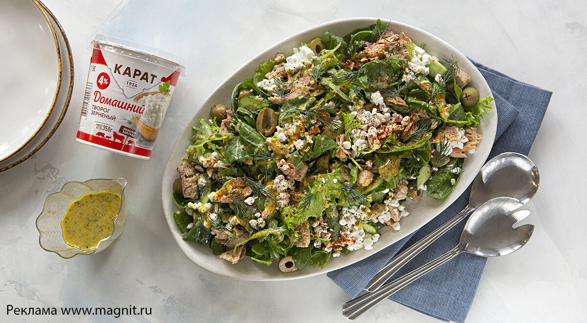Ему отдают предпочтение те, кто серьезно занимается спортом, и те, кто хочет похудеть. Он помогает забыть о простуде и продлевает молодость. Все это о твороге, а точнее – о зерненом твороге. Эти фактурные зернышки любят даже те, кто обычно магазинный творог обходит стороной. Зерненый творог - диетический и полезный продукт, он открывает массу новых возможностей для тех, кто любит готовить. О пользе и вкусных блюдах из зерненого творога в нашей новой статье. А пока делимся РЕЦЕПТОМ ⬇️ 🥗 Салат с консервированной горбушей, творогом и укропом Время приготовления: 15 мин Для приготовления 4 порций нужно: 1 упаковка творога зерненого «Домашнего» «КАРАТ» (350 г) 2 банки консервированной горбуши в собственном соку 1 средний огурец 70 г салатных листьев 40 г оливок без косточки 2 веточки укропа 1 ст.л. дижонской горчицы 1 ст.л. лимонного сока ½ ст.л. оливкового масла ½ ч.л. копченой паприки соль и свежемолотый чёрный перец Как приготовить: 1. Огурец нарежьте