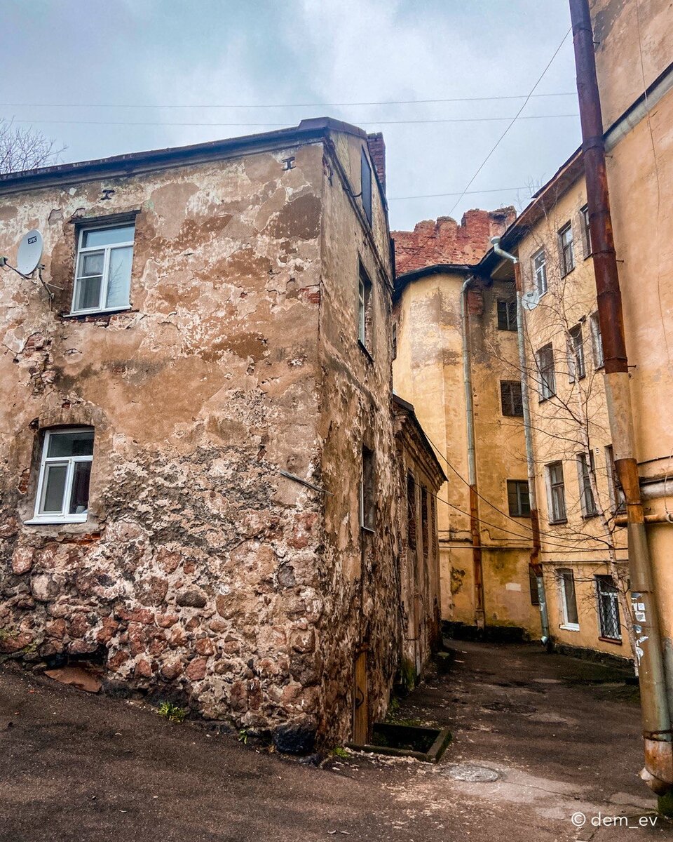 Внешне, под облупившейся штукатуркой, виднеются не только привычные красные кирпичи, но и огромные гранитные валуны.