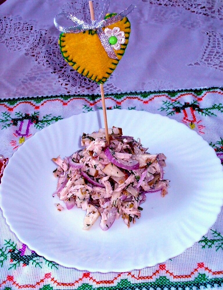 *половинка куриного филе, варено - копченого (подойдёт и просто варёное),
