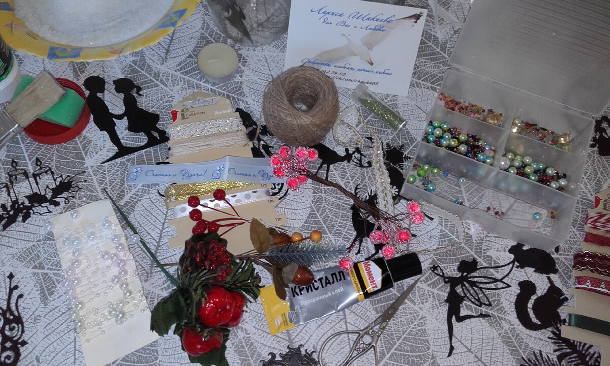 ДД - деревенский декор из обычной стеклянной банки. Есть настоящее волшебство в миниатюрных огоньках, поблескивающих из-за стекла. Сегодня вы узнаете, как сделать красивый новогодний светильник в банке. Вам не нужно быть мастером хенд-мейда, чтобы создать эту красоту. Технология достаточно проста, чтобы ее мог освоить даже начинающий. Материалы тоже понадобятся самые простые: стеклянная емкость на ваш вкус и свеча, как вариант светодиодная свеча или гирлянда длинной 1 м на батарейках. Материалы и инструменты: стеклянная банка с горлышком достаточно широким, чтобы свободно проходила ладонь (лучше — с небольшим запасом), клей ПВА, салфетки, соль, глитер, клей "Момент-кристалл",декоративные элементы для украшения, ленты, тесьма, силуэты фигур, свечи или короткая гирлянда на батарейках. 1. Тщательно вымойте банку, снимите этикетки. Высушите. 2. Заготовте силуэты фигур, которые нужно вклеить внутрь банки, темной стороной наружу. Я брала ножи для вырубки и черный картон. 3. Берем любую