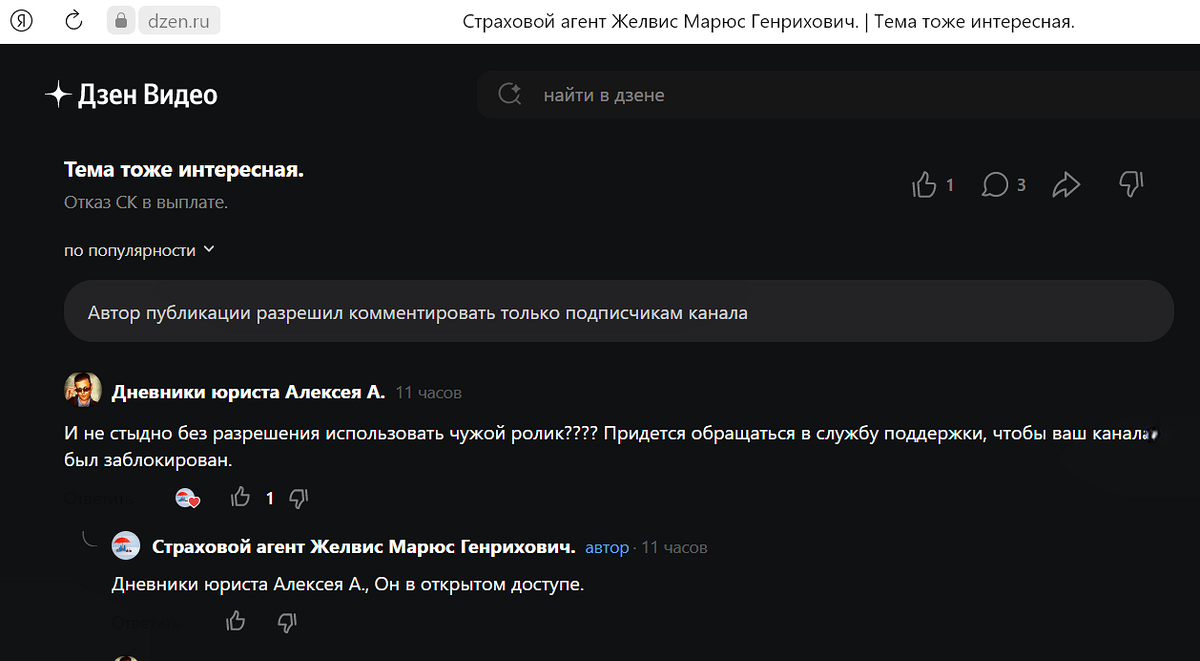 Вчера, 5 декабря 2022 года, листая ленту Дзена, я увидел свой собственный ролик, в котором я рассказываю о том, что делать, если страховая компания отказала в заключении договора ОСАГО (ссылка на ролик), опубликованный на чужом канале! Не буду использовать в статье яркие и красочные эпитеты в сторону автора канала, который, мягко говоря, присвоил себе мое видео, назову его "недобросовестным". Так вот, этот недобросовестный "автор", без зазрения совести, без моего согласия, без указания под видео авторства и т.п., взял, скачал мое видео, переименовал его и опубликовал на своем канале! Если честно – такой наглости я не ожидал! Под "стибренным" видео я оставил комментарий, в надежде на то, что «автор» удалит ролик, но как же я заблуждался…. «Автор» написал мне в ответ, дав мне понять, что, так как видео находится в свободном доступе, он имеет право его скачать и опубликовать у себя (я его понял именно так)! Скриншот переписки Честно – еще большей наглости я не ожидал! Мне ничего не остава