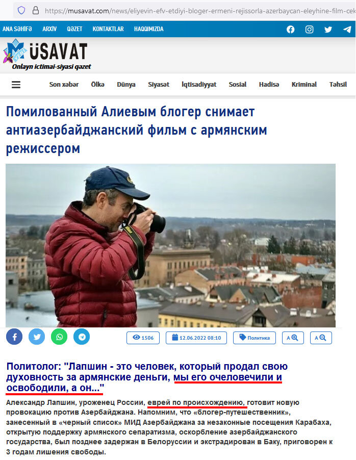 Как завещал великий, благословенный и равный Аллаху верховный правитель древнего Азербайджана, Ильхам Памятникович Алиев - ни дня без Лапшина! Народ, я уже ржу с этих людей. Ощущение, что там одна рука не знает, что другая делает. Пока министерство пропаганды посредством кучи ботов и троллей с пустыми аккаунтами бегает в мой блог и пишет "про Лапшина давно забыли!", другой департамент ежедневно обо мне пишет и распространяет статьи по всем их СМИ. Это уже третья статья за последние три дня. Вспоминается анекдот "Рабинович, вы или крестик снимите, либо трусы наденьте". Как вам их душещипательное выражение "Мы его ОЧЕЛОВЕЧИЛИ, а он...", я аж чаем чуть не поперхнулся от смеха. Но без антисемитизма снова не обошлось, эти поборники толерантности в каждой статье тыкают в мое еврейское происхождение. Всеми силами пытаются раскрутить в Азербайджане антисемитизм, при этом твердя о любви к евреям и Израилю. Процесс очеловечивания по-азербайджански представляет собой банальный криминал и нападени