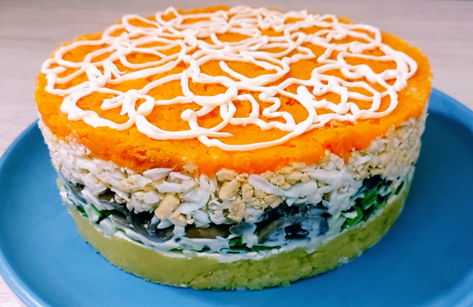 Сегодня готовим салат на новогодний стол. Салатик из обычных простых продуктов, но очень вкусный и к тому же сытный. Вашим гостям обязательно понравится. Видео - рецепт: Как приготовить: 1. Одну среднюю луковицу очищаем и нарезаем мелким кубиком. 2. Свежие шампиньоны 400 грамм, предварительно моем, сушим и нарезаем на пластинки. 3. В сковороду наливаем растительное масло примерно 5 столовых ложек и опускаем нарезанный лук. Жарим лук на среднем огне до мягкого состояния. 3. Теперь к луку добавляем нарезанный шампиньоны и жарим грибы с луком до готовности. По времени занимает примерно минут пять. В конце добавляеи соль и перец по вкусу. Я кладу немного черного молотого перца. Хорошо перемешиваем и снимаем сковороду с плиты. 4. А теперь подготовим остальные ингредиенты Предварительно отваренный в мундире картофель очищаем и натираем на крупной терке. 5. Отварные яйца также натираем на крупной терке. 6. Отварную морковь натираем на средней терке. 7.Нарезаем пучок зеленого лу