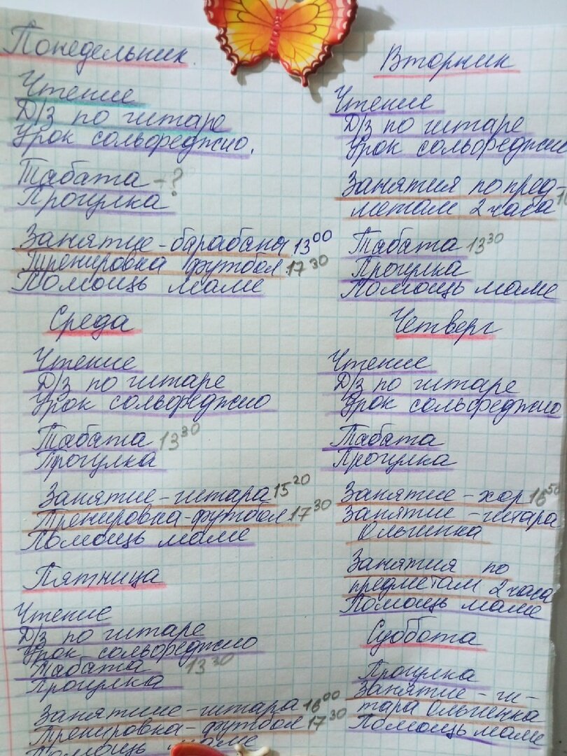 Мы составили примерное расписание. Почему «примерное»? Потому что оно у нас для ориентира… Чтобы примерно знать, что в какой день у нас происходит… Есть дела повторяющиеся каждый день… Это то, что никогда не лишнее. Стараемся придерживаться… Кстати, «табата» - это комплекс физических упражнений на 15 минут, кардионагрузка. Я сама его практикую. Вадим, если хочет, присоединяется. Если не хочет именно этот комплекс, выбирает сам для себя то, что ему нравится, на разные группы мышц. Тогда он занимается сам… К слову сказать, нам нравится проводить время вместе. Сегодня разбирали новую тему по математике, повторяли русский язык… Есть у нас «традиция» играть мячом в подобие футбола… Есть познавательные настольные игры, в которые можно играть вдвоём… Тоже сегодня играли… Так что всё не так уж страшно… Только остаётся моё желание почаще выходить из дома, больше медитировать (не ночью), работать из дома и не только… Посмотрим, как мне удастся его осуществлять. Ведь это хорошо, когда у челове