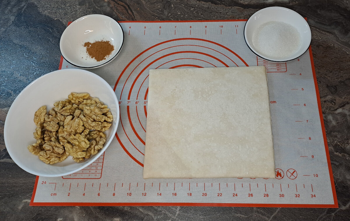 Здравствуйте! Я всегда держу в морозилке упаковку слоеного теста. И когда хочется быстро что- нибудь испечь, оно меня очень выручает. Сегодня поделюсь рецептом слоёных ушек с орехами. Итак начнем. Грецкие орехи промываем, обсушиваем. Можно дополнительно слегка обжарить на сковороде. Мелко рубим их ножом. В тарелке смешиваем орехи, сахар и корицу. Пласт теста немного раскатываем. Выкладываем тонким слоем на него начинку. И начинаем заварачиват рулетом с двух сторон, навстречу друг другу. Затем нарезаем на кусочки толщиной 1 см. Выкладываем на противень, застеленный пергаментом. И запекаем в разогретой до 180 градусов духовке до золотистого цвета. Получаются вот такие красивые штучки. Для приготовления слоёных ушек потребуются ингредиенты: слоеное тесто - 1 упаковка (в моей было 2 пласта), грецкие орехи - 150 г, сахар - 2 столовые ложки, корица. Рецепт очень простой и быстрый. Можно сделать такие ушки с другими орехами, можно вобще без орехов. Вариантов множество. Приятного аппетита!
