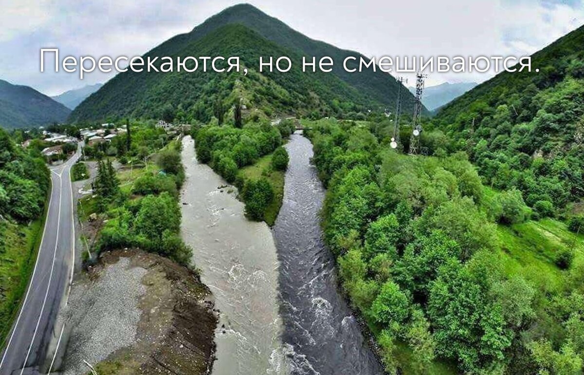 🌊 Пересекаются, но не смешиваются. Реки Белая Арагви и Чёрная Арагви в Грузии, воды которых пересекаются, но не смешиваются. Причина, по которой они не смешиваются, связана с содержанием, плотностью, температурой, высотой и поверхностным натяжением дна, которое развивается между ними, что действует как тонкая стена, препятствующая их смешиванию.