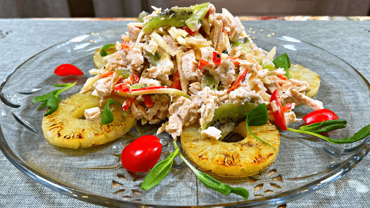 Салат из курицы с ананасом и другими интересными ингредиентами, рецепт простой и быстрый.